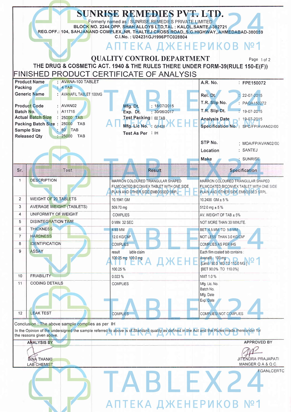 Таблетки Авана 100 отличает ряд преимуществ, выделяющих их среди других аналогов: