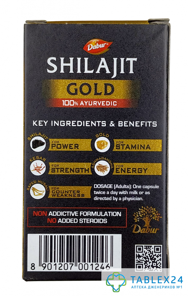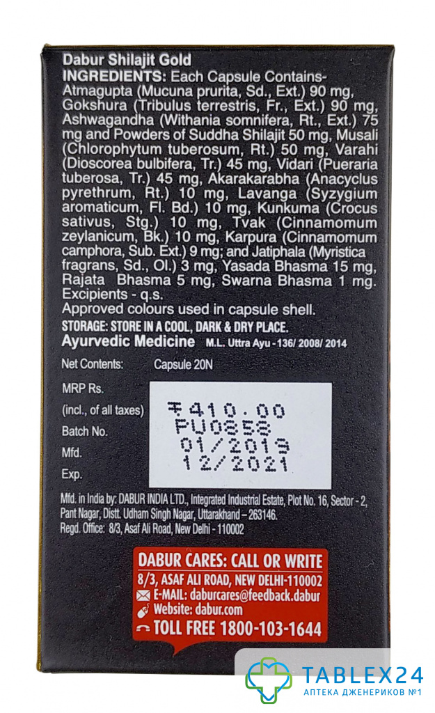 Благодаря ему, а также огромному числу экстрактов и порошков из различных частей целебных растений Shilajit Gold Dabur обладает мощным возбуждающим, сексуально стимулирующим, омолаживающим, тонизирующим, иммуномодулирующим свойствами.