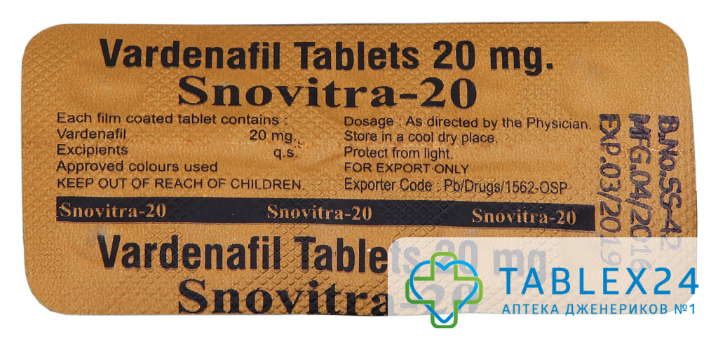 Препарат Snovitra 20 – качественная копия Левитры, в составе которой содержится 20 мг действующего вещества, то есть максимальная доза варденафила, способная противостоять серьезным эректильным расстройствам и нарушениям потенции. Действие препарата основано на оказании блокирующего действия на фермент ФДЭ-5, вследствие чего в органах малого таза стабилизируется нормальный кровоток, а также устраняется помеха для прилива крови к половому члену в процессе сексуального возбуждения.