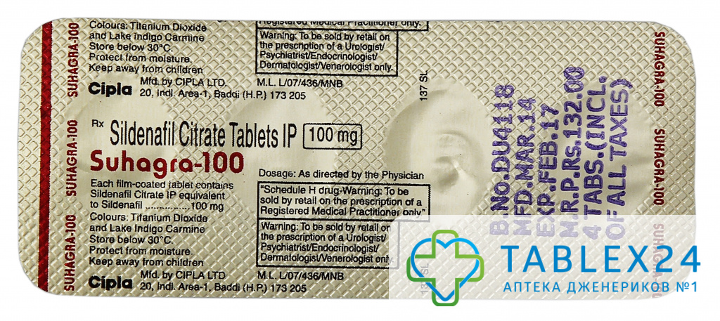 Индийское лекарство Сухагра 100 купить можно в таблетках, содержащих 100 мг действующего вещества, – суточную дозу, рассчитанную на 1-2 приема. В зависимости от степени выраженности патологии в день принимается одна или половина дозы. Эффект от таблетки становится заметным через час, то есть лекарству требуется некоторое время, чтобы метаболизироваться в организме. В дальнейшем влияние дженерика на потенцию сохраняется до 5 часов. Главным фактором для пробуждения эрекции в течение этого периода становится наличие эротической стимуляции, которая приводит в активность кровоток, наполняющий пещеристые тела полового органа. По мере снижения концентрации вещества в крови, эффект терапии ослабевает и влияние силденафила нивелируется.